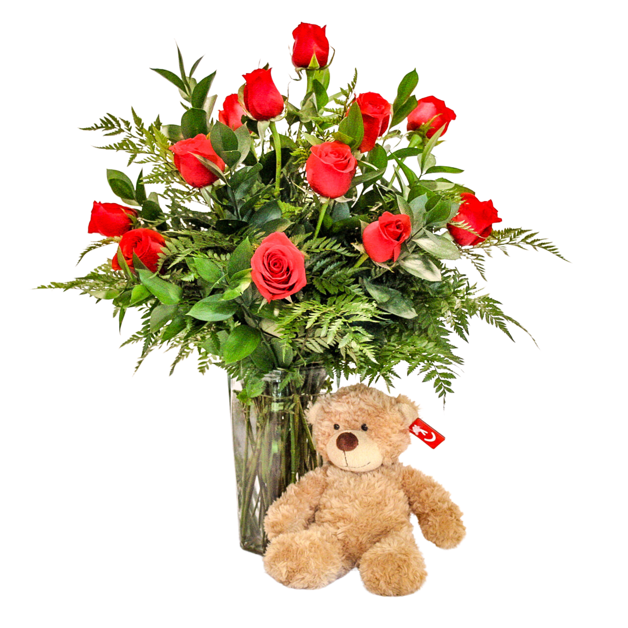Dozen Roses in clear vase with a large bear.