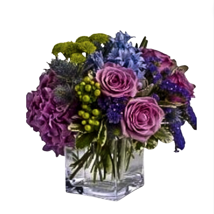 Designed in a contemporary glass cube, lavender roses, blue hydrangea, delphinium & purple statice contrast with green hypericum berries & green buttons in this garden-chic design.