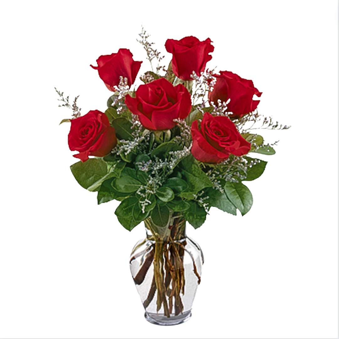 Six premium long stem roses designed in a clear vase with greenery & baby's breath. If you want a different color than red, please tell us under notes. Colors available include red, yellow, pink, white, and lavender.