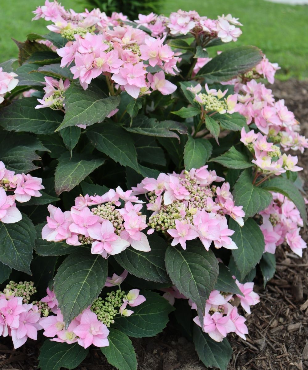 Pink or blue double florets bloom from early spring to frost on this prolific reblooming Hydrangea. Reaches 2 to 3 feet tall and wide. Blooms are pink or blue dependent upon soil acidity. Plant in part shade, keeping out of afternoon sun. Plant in well draining soil.