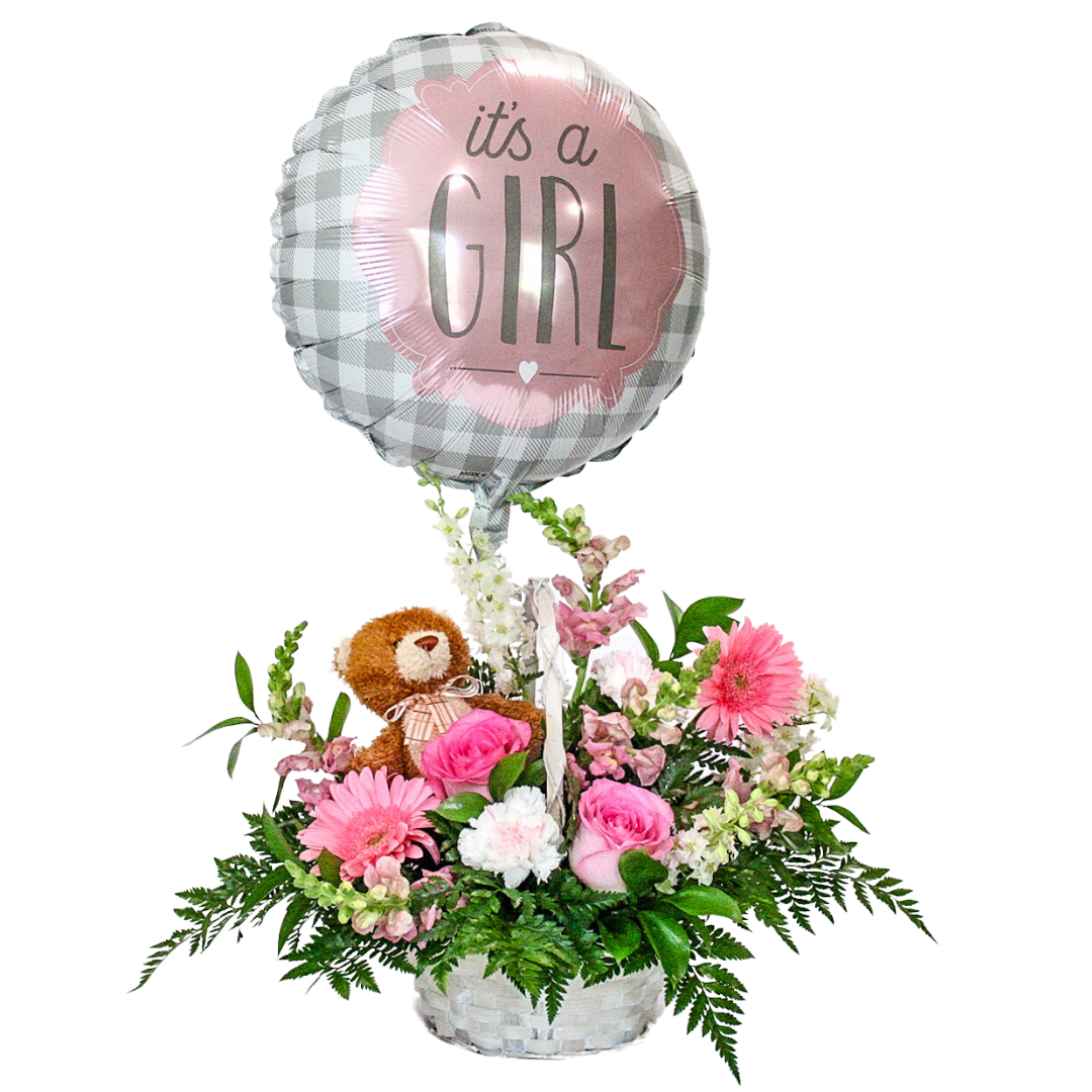 Oh baby! Celebrate the newest addition with this beautiful basket, stuffed with pink and white Roses, Snapdragons, Carnations, and Gerbera Daisies. Add a nylon balloon for $6!