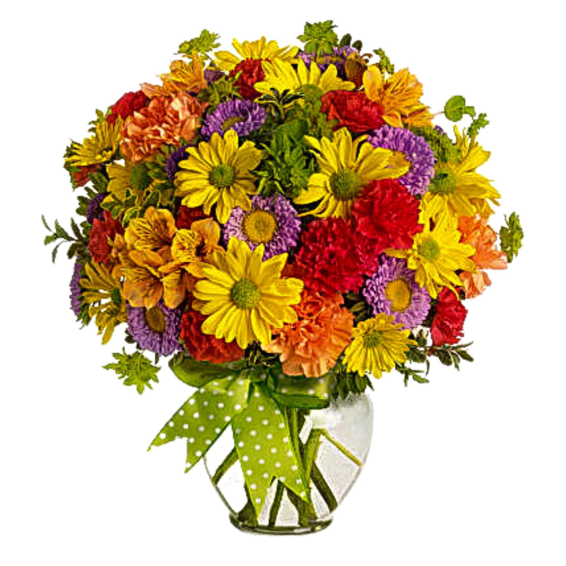 Teleflora creates a summery mix of yellow daisy chrysanthemums, purple asters, red and orange carnations and more, adorned with a cheerful bow. Send one today, and make someone's day!