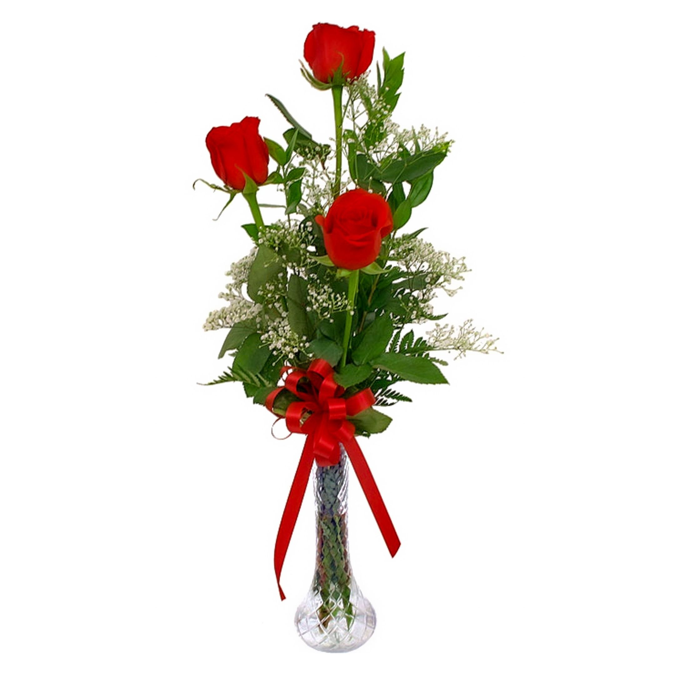 3 Long Stem Roses arranged in a bud vase with greenery & baby's breath. Available in your choice of seven vibrant colors---- Tell us your color choice--- red, pink, yellow, white, lavender, orange, or bi-color---under special instructions