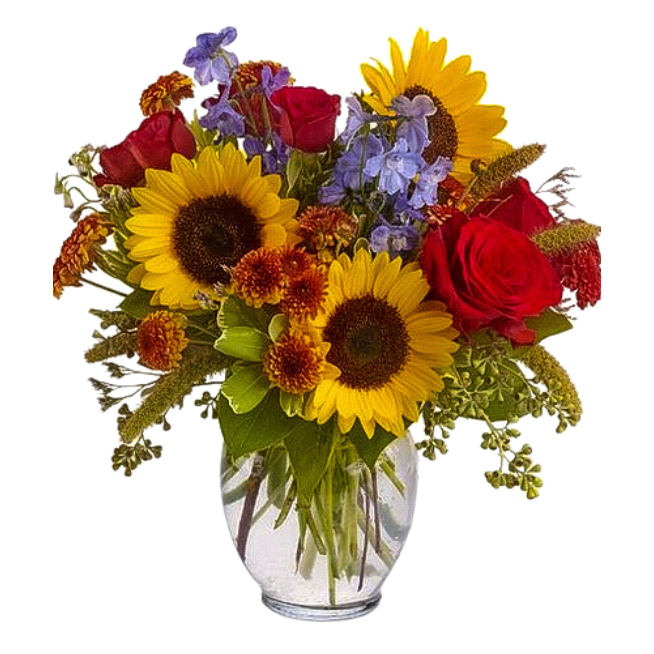 Beautiful Sunflowers decorate this seasonal arrangement.