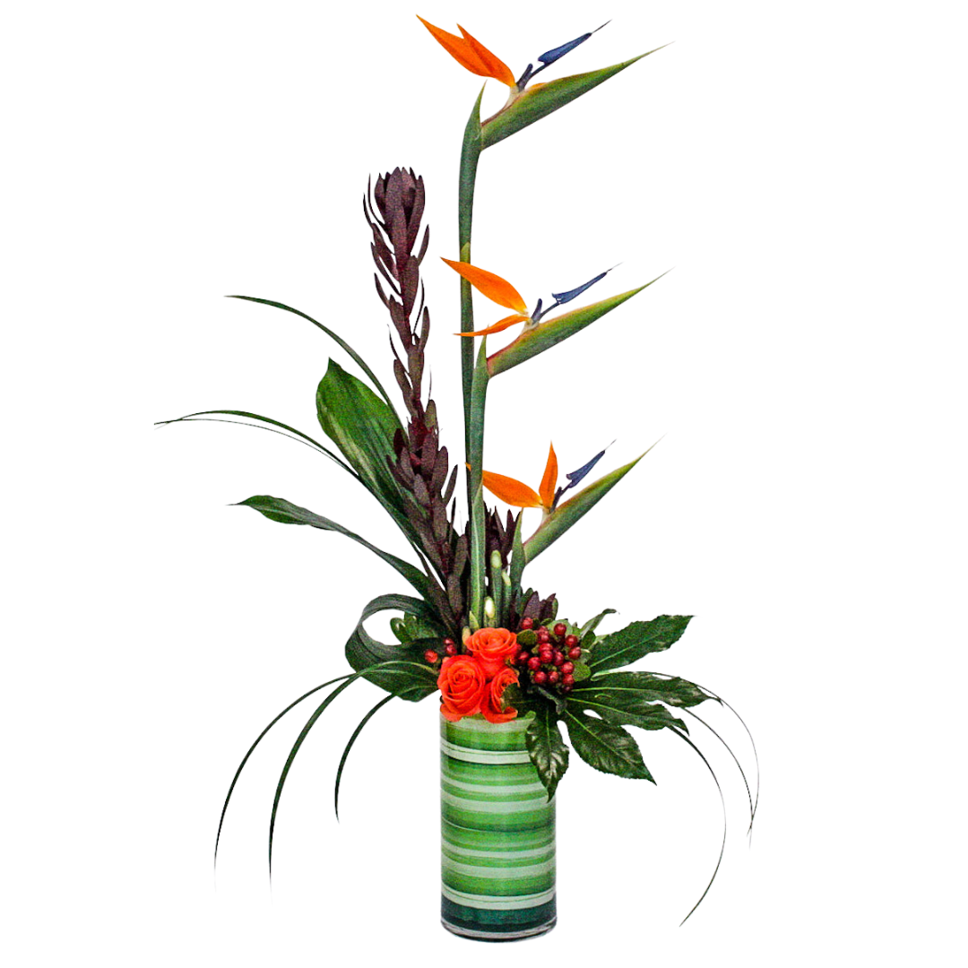Who said Richmond can't be tropical? Bring the tropics to you with Birds of Paradise, Safari Sunset, Roses, hypericum, and Tropical foliage arranged in a beautiful vase.