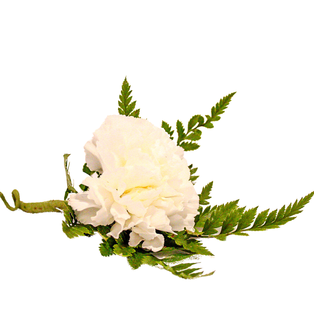 Looking for that finishing touch to your dress attire? This beautiful white carnation boutonniere might just be what you need! More color options available for ordering over the phone.