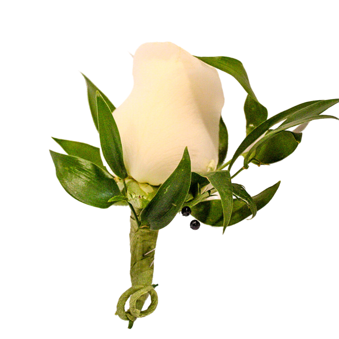 Looking for that finishing touch to your dress attire? This beautiful white rose boutonniere might just be what you need! More color options available for ordering over the phone.